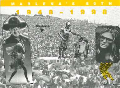 Marlena's 50th Birthday Bash In June of 1998, Marlena threw a party to honor her 50th birthday and the rite of passage it represented. She threw a party to end all parties, including a "boomitzvah" honoring other "baby boomers" attending. Also, with the collaboration of Rita Abrams and featuring a seasoned professional cast, she wrote a show that parallels five decades of major historical events in relationship to her true life experiences. Please click the links below to read the invitation, decade costume guidelines, program, and Pacific Sun Article, and click to watch the video on YouTube. The celebration is the first part of the YouTube video; you can also click just to see the very funny and outrageous show where indicated. "...open our heads, let the pictures come-if we close all our eyes together, then we will see where we all come from..." -Mick Jagger |